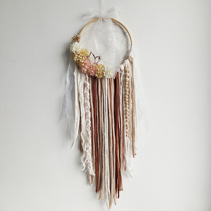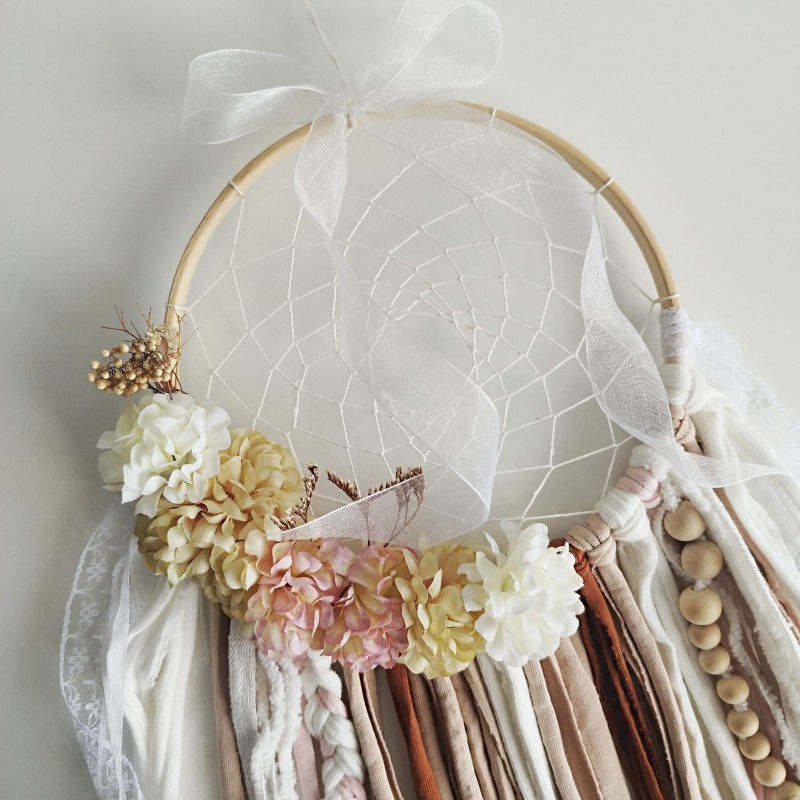 con detalles de trapillo, puntilla, tul, cuentas de madera, flor seca, flor de pape y flor de tela.